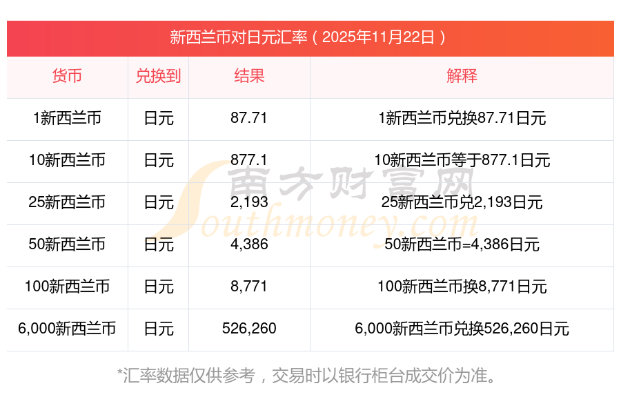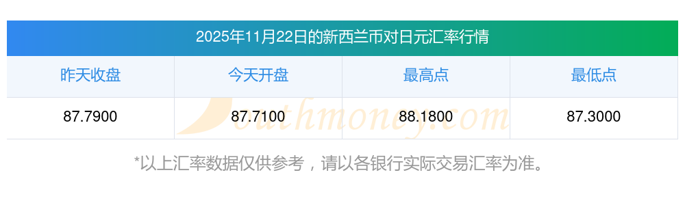 新西蘭元對日元的匯率今日一覽2025-11-22
