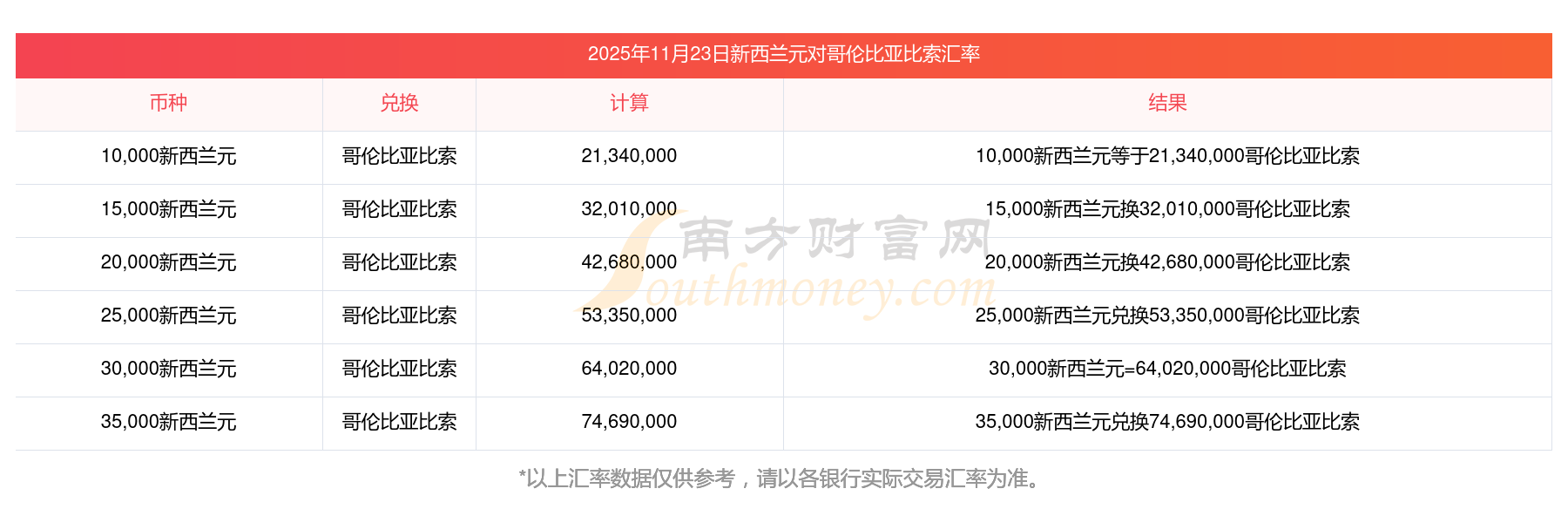 今天新西蘭元外匯價格 今日新西蘭元對哥倫比亞比索匯率一覽表2025年11月23日