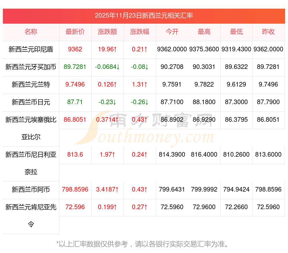 2025年11月23日新西蘭元相關(guān)匯率查詢