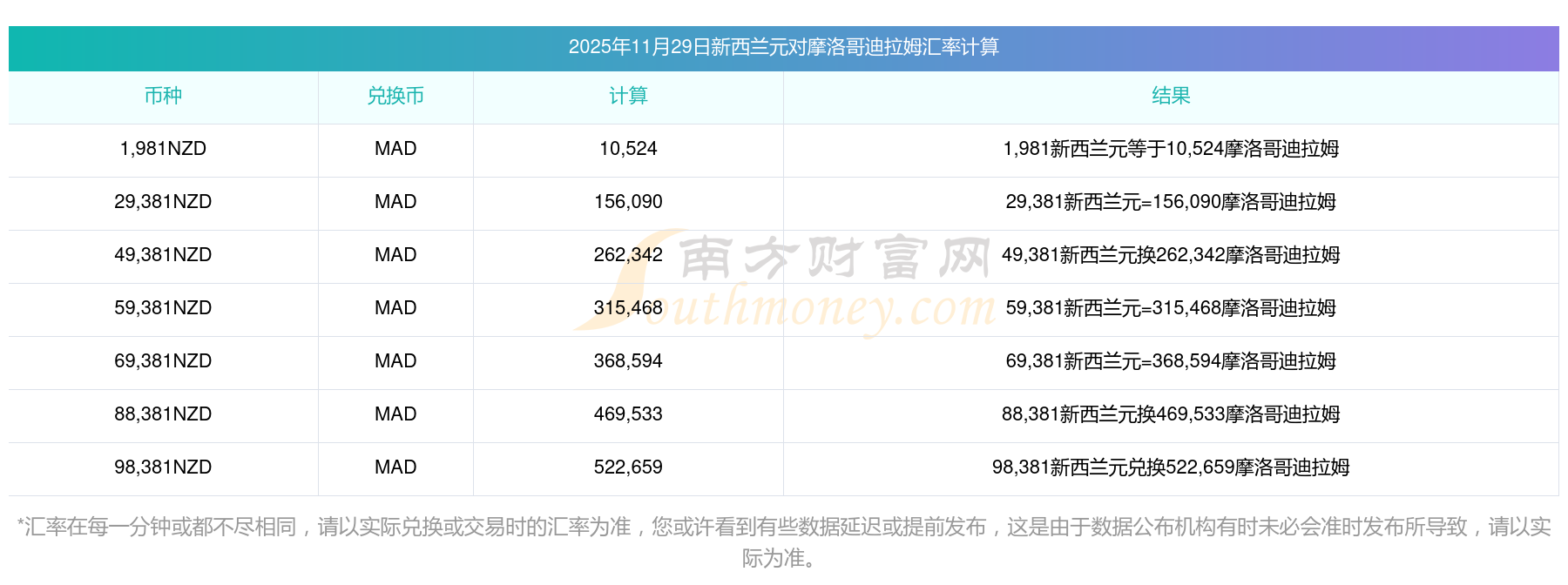 南方財富網為您提供新西蘭元對摩洛哥迪拉姆匯率最新價格詳情。