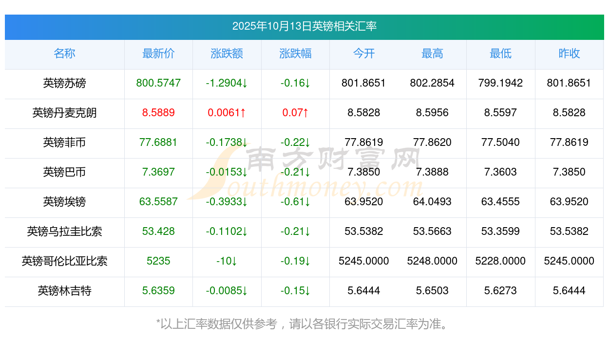 2025年10月13日英鎊相關(guān)匯率查詢(xún)
