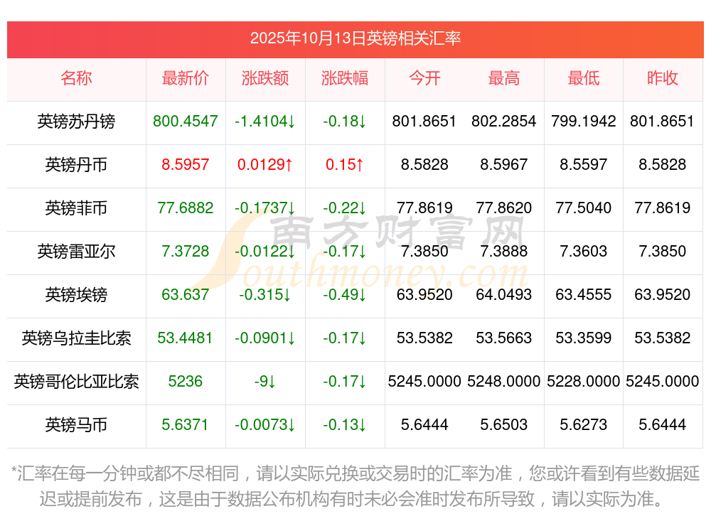 根據(jù)2025年10月13日匯率,英鎊兌換秘魯新索爾匯率最新價4.582100,今開價4.5898,昨收價4.5898,最高價4.5922,最低價4.5746。