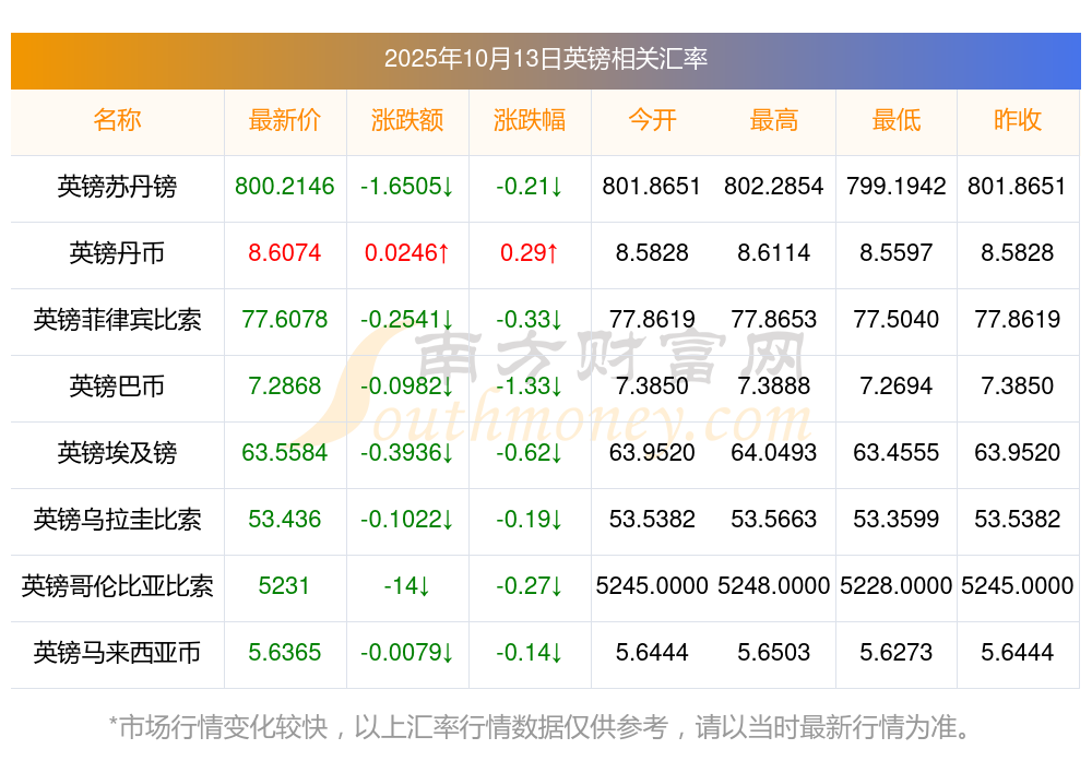 2025年10月13日英鎊相關匯率查詢