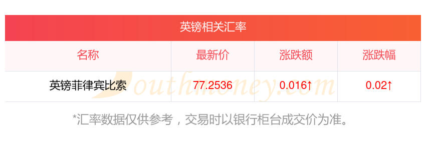 根據(jù)2025年11月25日匯率,英鎊兌換菲律賓比索匯率最新77.253600,今開77.2376,昨收77.2376,最高77.2667,最低77.1410。