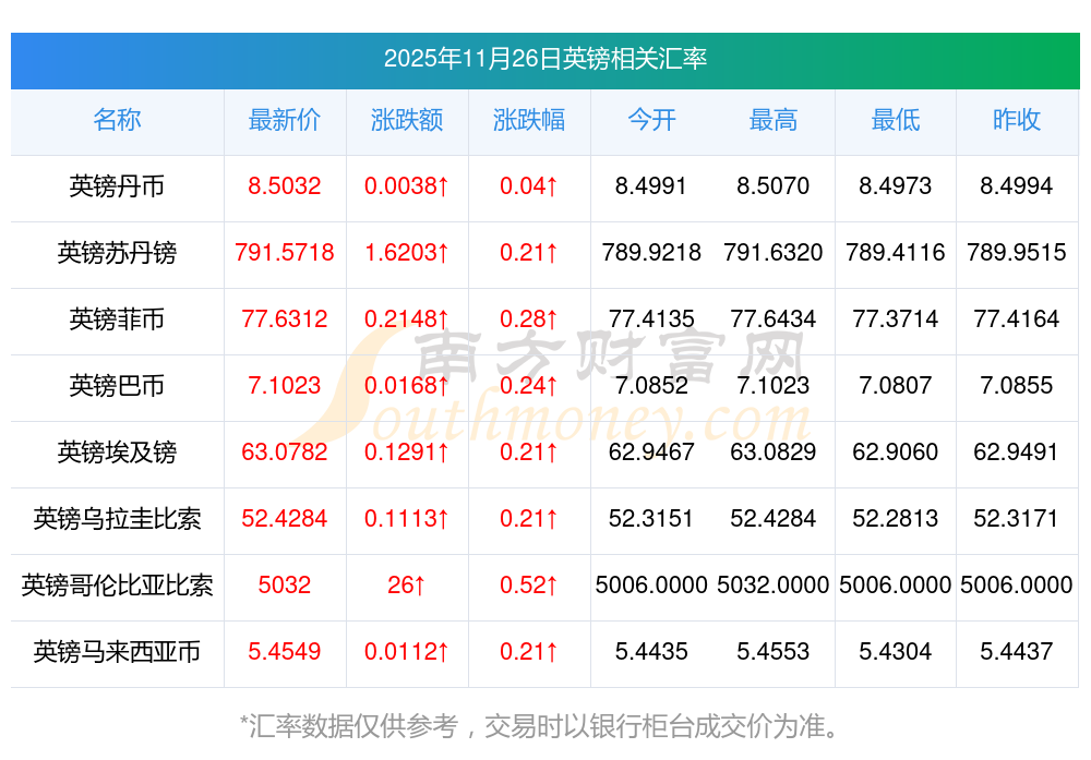 根據今天2025年11月26日匯率計算,GBP兌換JMD匯率最新價211.290000,今開價210.8800,昨收價210.8900,最高價211.7700,最低價210.7300。