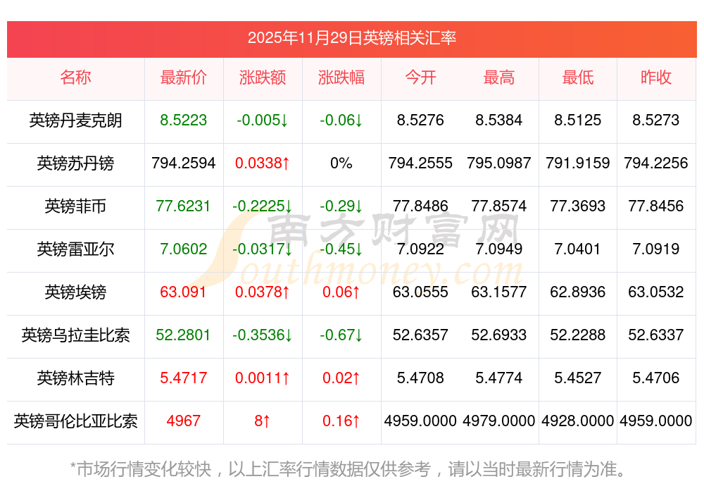 根據(jù)2025年11月29日匯率計算,GBP兌換ETB匯率最新價203.349100:今日開價204.3229,昨日收價204.3152,最高價204.4001,最低價202.9728。
