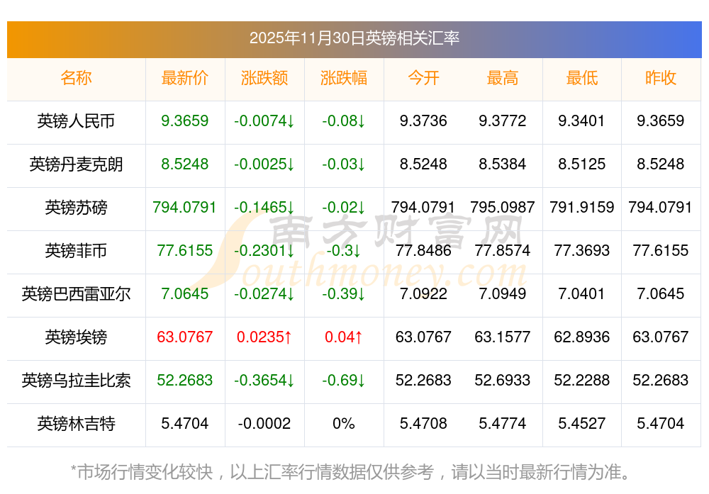 2025年11月30日最新消息,英鎊兌換瑞典克朗最新匯率為12.510800,今開為12.5520,昨收為12.5108,最高為12.5680,最低為12.4875。