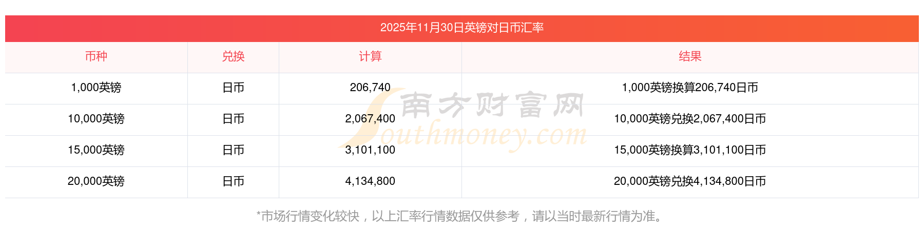 英鎊匯率:今日英鎊對日元匯率是多少?11月30日