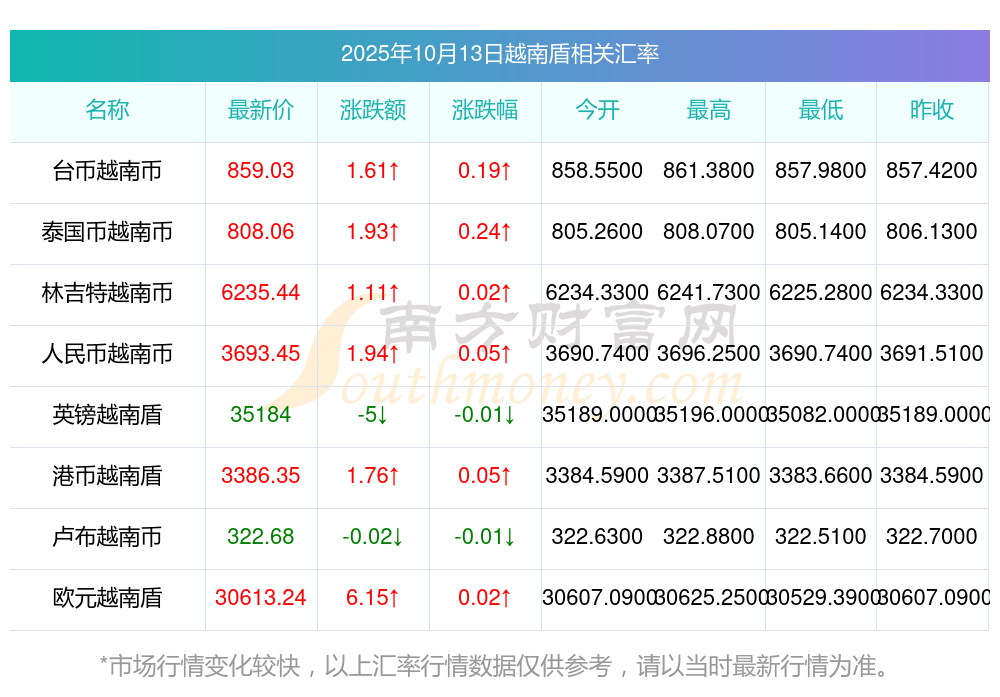 根據(jù)2025年10月13日匯率,越南盾兌換蘭幣匯率最新價(jià)0.000658,今開價(jià)0.0007,昨收價(jià)0.0007,最高價(jià)0.0007,最低價(jià)0.0007。