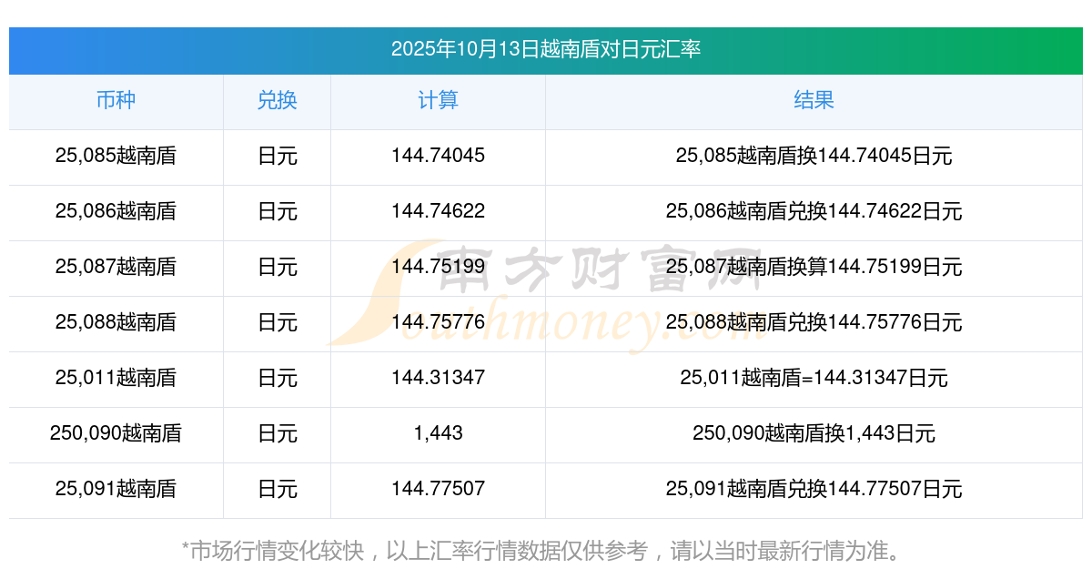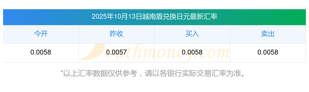 越南盾對日元匯率今日走勢?2025/10/13