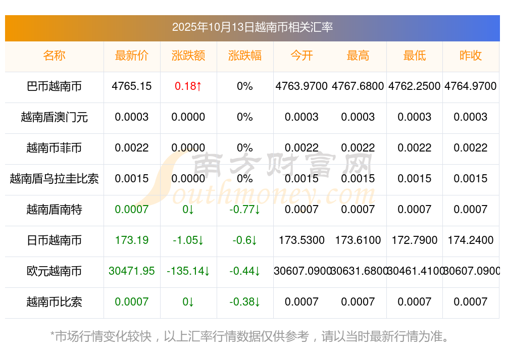 根據(jù)2025年10月13日匯率,越南幣兌換瑞郎匯率最新價0.000031,今開價0.0000,昨收價0.0000,最高價0.0000,最低價0.0000。