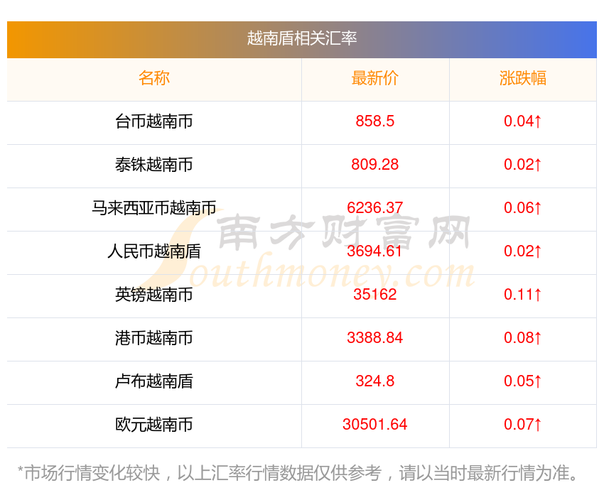 南方財富網(wǎng)為您提供越南盾對挪朗匯率最新價格詳情。