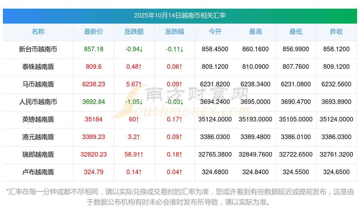 根據(jù)2025年10月14日匯率計(jì)算,VND兌換SEK匯率最新價0.000361:今日開價0.0004,昨日收價0.0004,最高價0.0004,最低價0.0004。