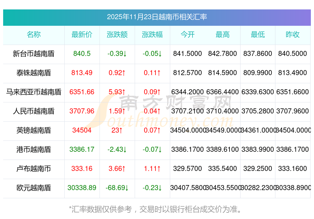 根據(jù)2025年11月23日匯率計(jì)算,越南幣兌換韓幣匯率最新價(jià)0.055780,今開(kāi)價(jià)0.0559,昨收價(jià)0.0558,最高價(jià)0.0561,最低價(jià)0.0557。