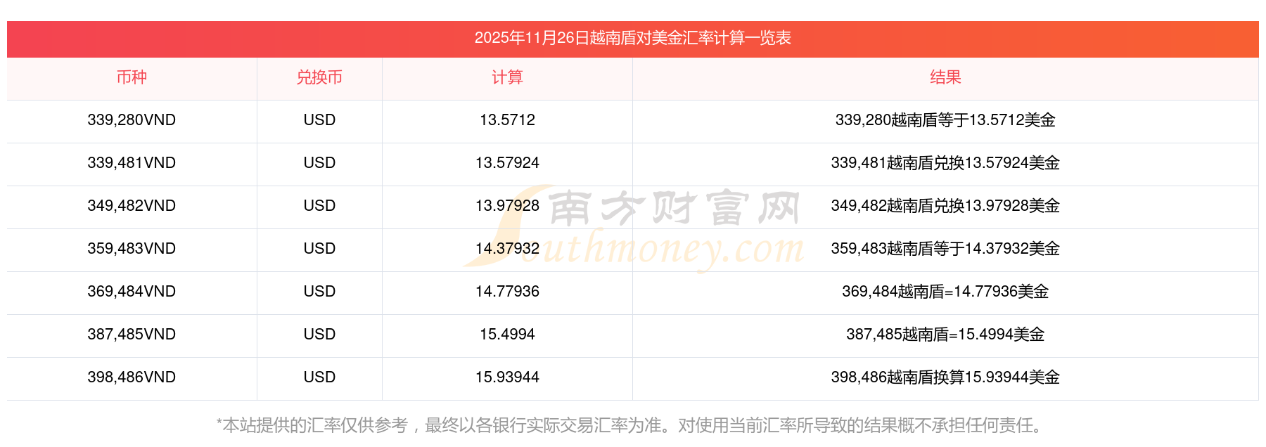 南方財富網(wǎng)為您提供越南盾對美金匯率最新價格詳情。