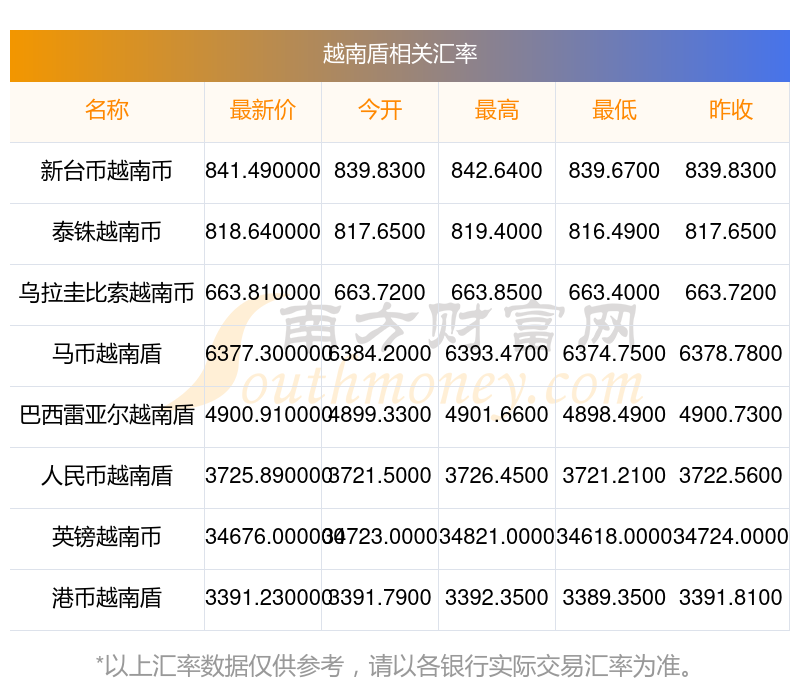南方財富網(wǎng)為您提供越南盾對瑞郎匯率最新價格詳情。