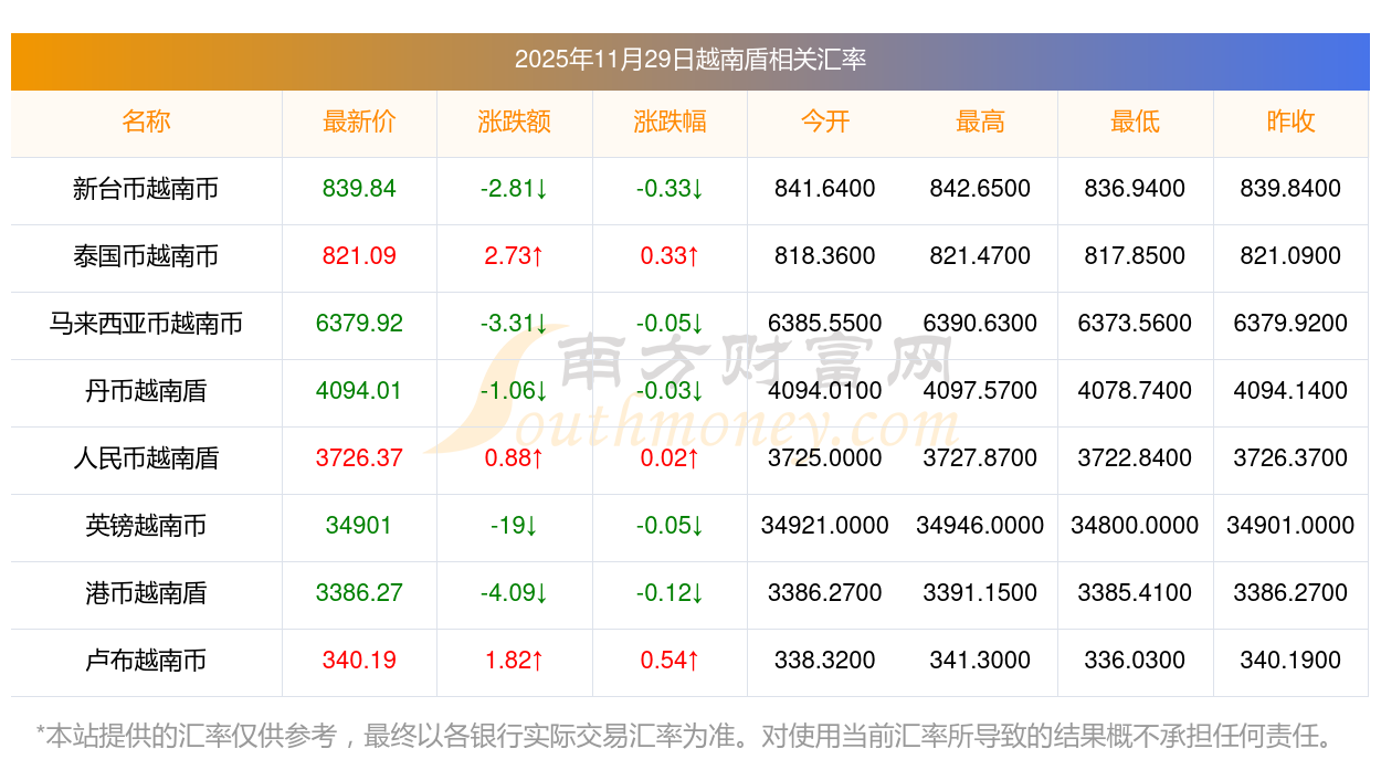根據(jù)今天2025年11月29日匯率計算,VND兌換MOP匯率最新價0.000305,今開價0.0003,昨收價0.0003,最高價0.0003,最低價0.0003。