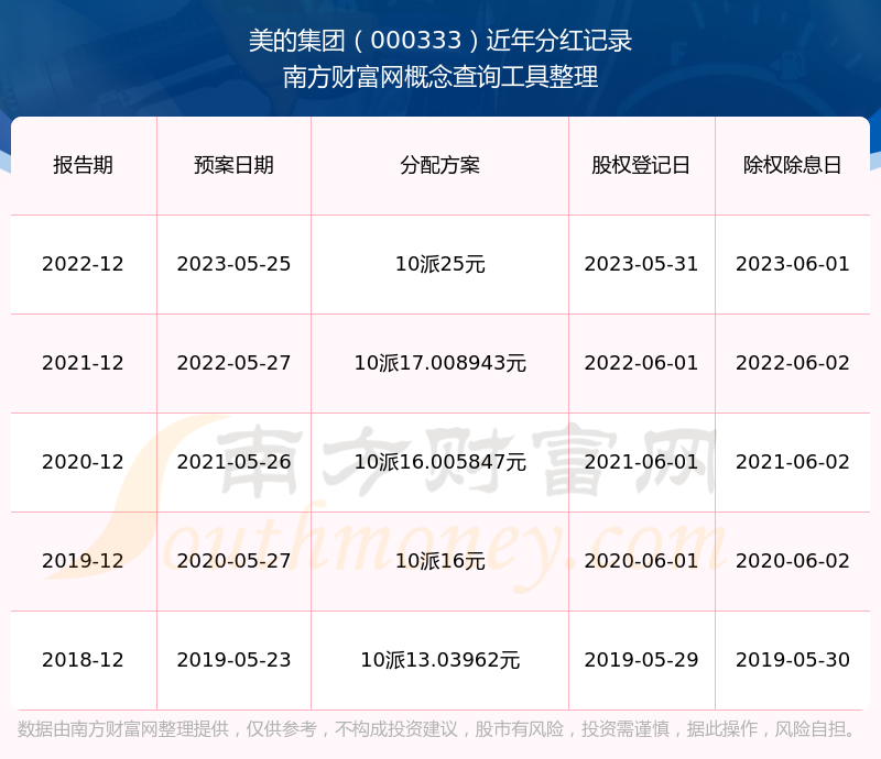 美的集團(tuán)最新一次公布的分紅方案為10派25元。本次權(quán)益分派股權(quán)登記日為2023年5月31日,除權(quán)除息日為2023年6月1日,派息日為2023年6月1日。