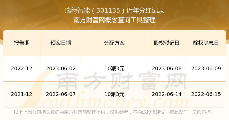 瑞德智能最新一次公布的分紅方案為10派3元。本次權益分派股權登記日為2023年6月8日,除權除息日為2023年6月9日,派息日為2023年6月9日。