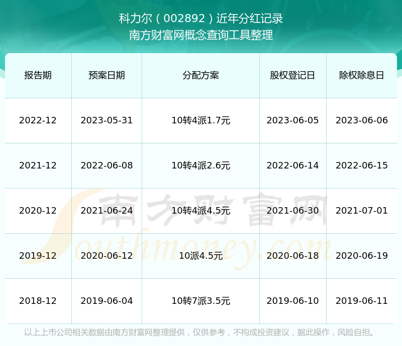 近年科力爾分紅情況如下表所示:
