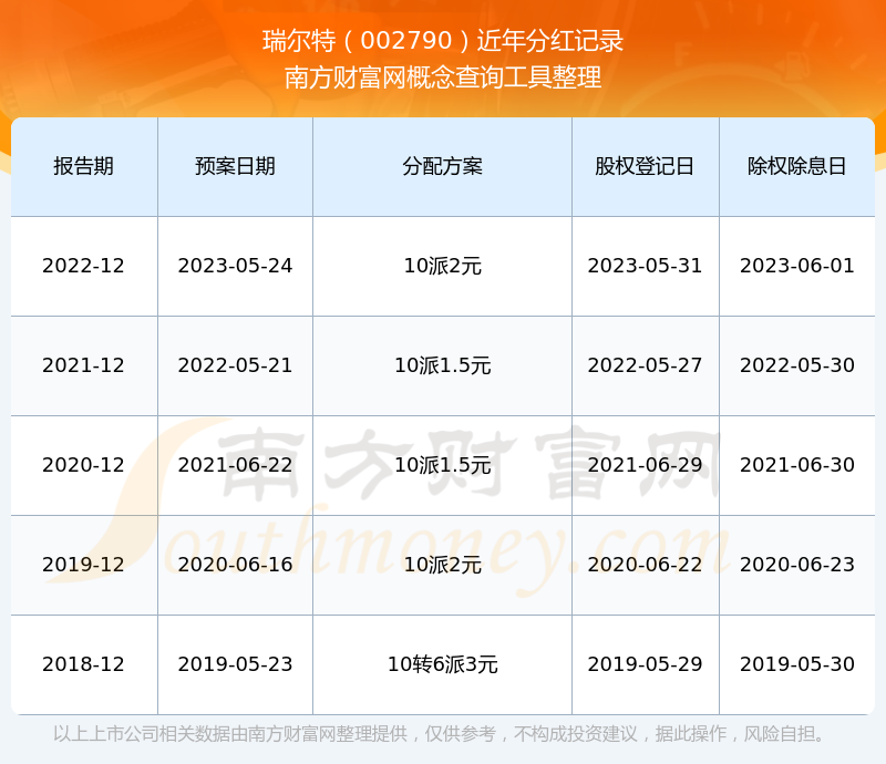 瑞爾特最新一次公布的分紅方案:10派2元。