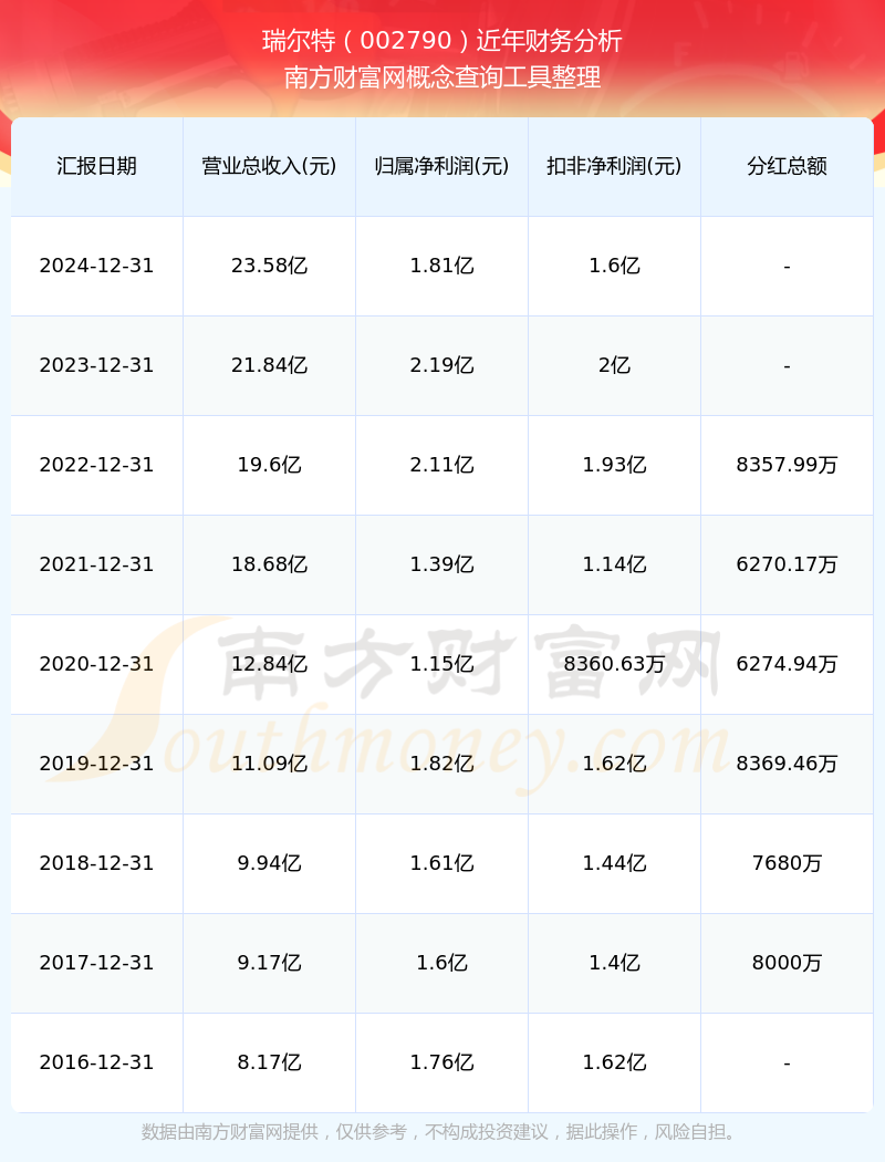 2024年瑞爾特總營收23.58億,同比增長7.96%;凈利潤1.81億,同比增長-17.17%;銷售毛利率27.35%。