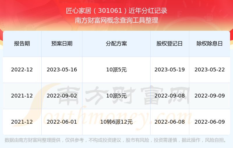 匠心家居歷年分紅派息情況如下表所示: