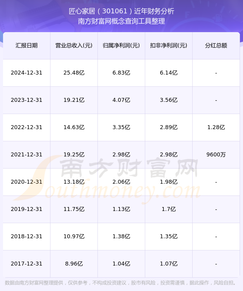 匠心家居公司2024年實(shí)現(xiàn)營(yíng)業(yè)收入25.48億元,同比增長(zhǎng)32.63%;凈利潤(rùn)6.83億元,同比增長(zhǎng)67.64%;毛利率39.35%。