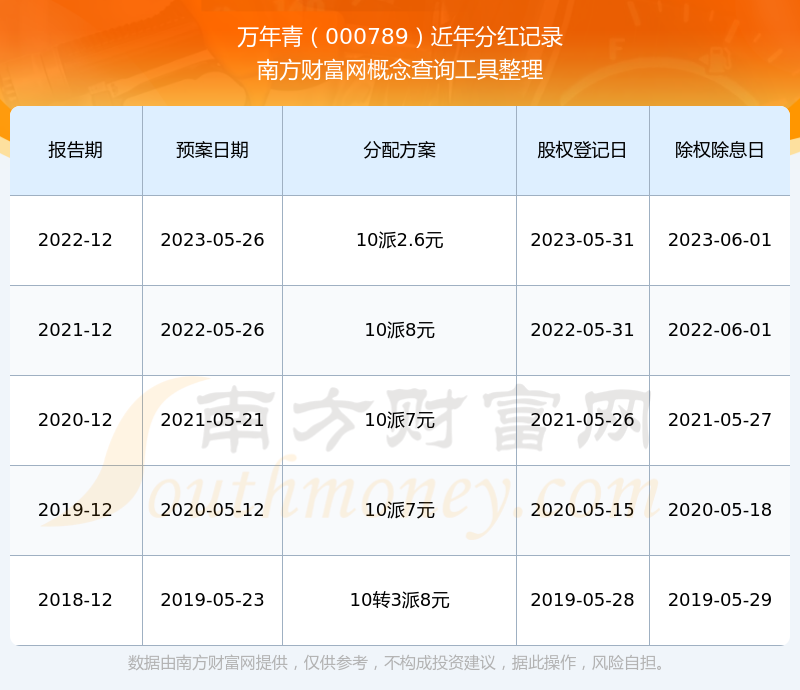 萬年青最新一次公布的分紅方案為10派2.6元。本次權(quán)益分派股權(quán)登記日為2023年5月31日,除權(quán)除息日為2023年6月1日,派息日為2023年6月1日。