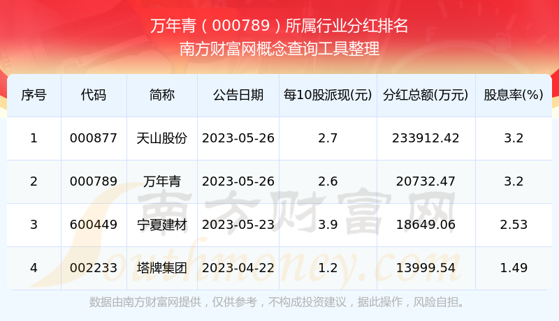 按照南方財富網(wǎng)趨勢選股系統(tǒng)統(tǒng)計,萬年青所屬行業(yè)為水泥行業(yè),水泥行業(yè)分紅排名情況如下表: