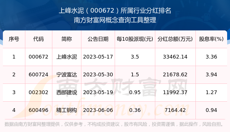 按照南方財(cái)富網(wǎng)趨勢(shì)選股系統(tǒng)統(tǒng)計(jì),上峰水泥所屬行業(yè)為水泥建材行業(yè),水泥建材行業(yè)分紅排名情況如下表: