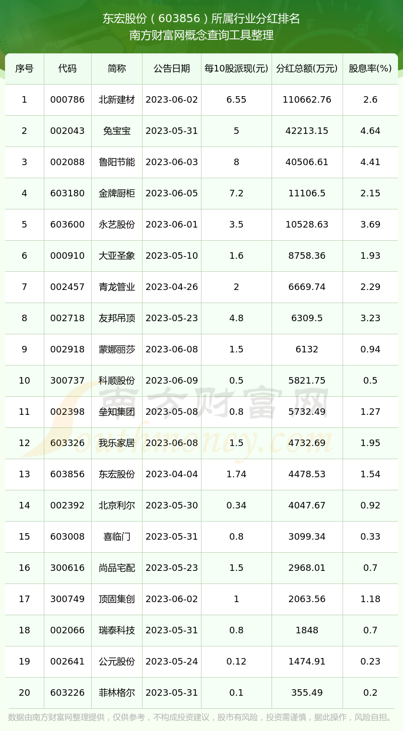 按照南方財(cái)富網(wǎng)趨勢選股系統(tǒng)統(tǒng)計(jì),東宏股份所屬行業(yè)為裝修建材行業(yè),裝修建材行業(yè)分紅排名情況如下表: