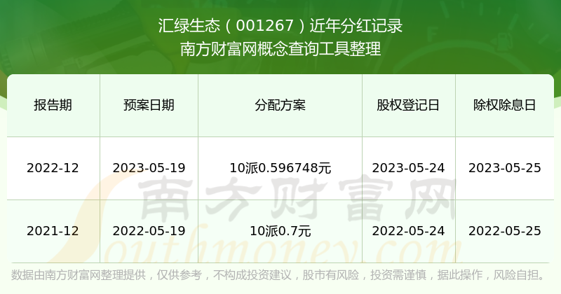 匯綠生態(tài)最新一次公布的分紅方案為10派0.596748元。本次權(quán)益分派股權(quán)登記日為2023年5月24日,除權(quán)除息日為2023年5月25日,派息日為2023年5月25日。