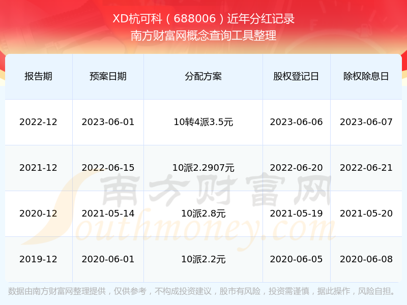 XD杭可科最新一次公布的分紅方案為10轉(zhuǎn)4派3.5元。本次權(quán)益分派股權(quán)登記日為2023年6月6日,除權(quán)除息日為2023年6月7日,派息日為2023年6月7日。