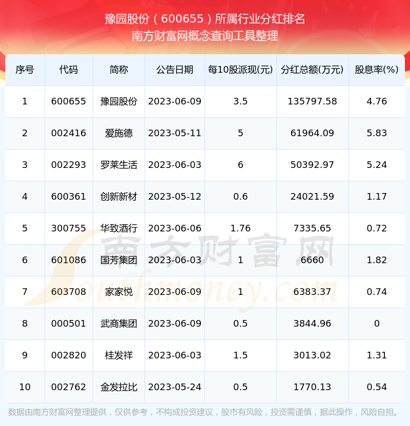 按照南方財富網(wǎng)趨勢選股系統(tǒng)統(tǒng)計,豫園股份所屬行業(yè)為珠寶首飾行業(yè),珠寶首飾行業(yè)分紅排名情況如下表: