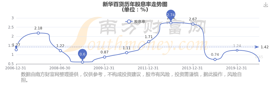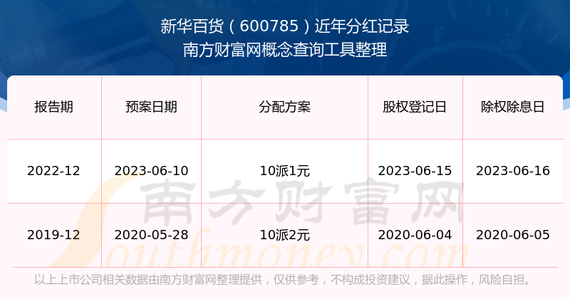 一、新華百貨(600785)股票分紅記錄 新華百貨最新一次公布的分紅方案:10派1元。 本次權(quán)益分派股權(quán)登記日為2023年6月15日,除權(quán)除息日為2023年6月16日,派息日為2023年6月16日。 近年新