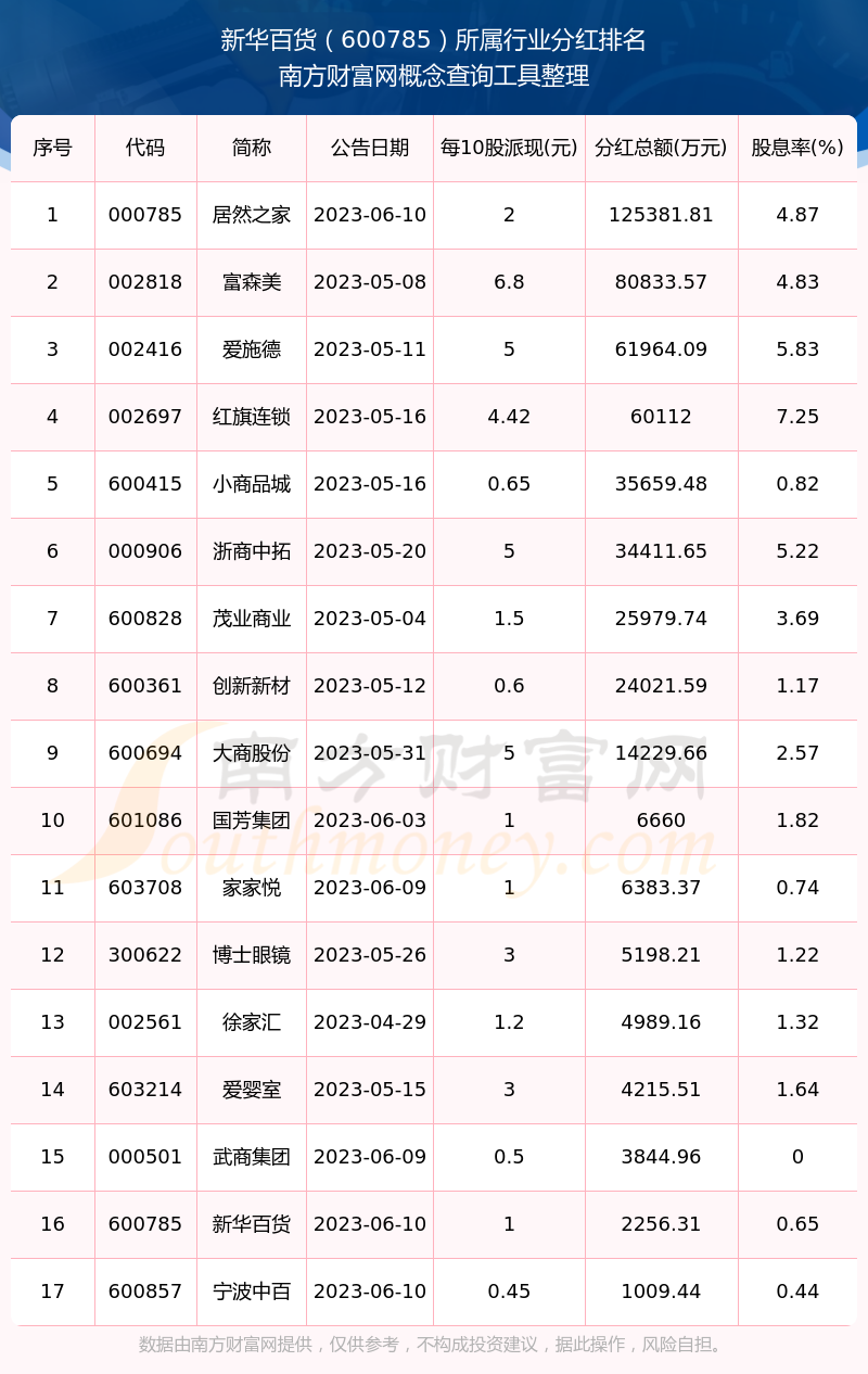 按照南方財富網(wǎng)趨勢選股系統(tǒng)統(tǒng)計,新華百貨所屬行業(yè)為商業(yè)百貨行業(yè),商業(yè)百貨行業(yè)分紅排名情況如下表: