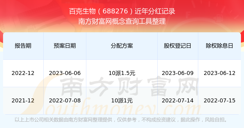 百克生物最新一次公布的分紅方案為10派1.5元。本次權(quán)益分派股權(quán)登記日為2023年6月9日,除權(quán)除息日為2023年6月12日,派息日為2023年6月12日。