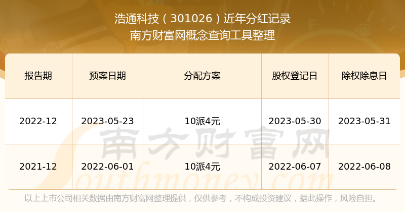 浩通科技最新一次公布的分紅方案為10派4元。本次權(quán)益分派股權(quán)登記日為2023年5月30日,除權(quán)除息日為2023年5月31日,派息日為2023年5月31日。
