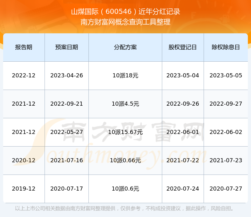 山煤國際最新一次公布的分紅方案為10派18元。本次權(quán)益分派股權(quán)登記日為2023年5月4日,除權(quán)除息日為2023年5月5日,派息日為2023年5月5日。
