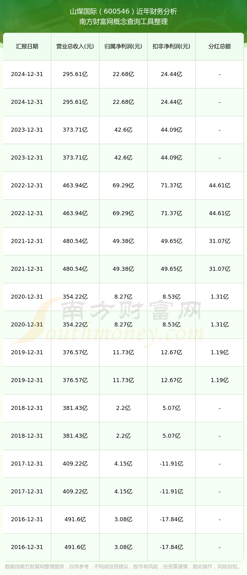 山煤國際公司2024年實現(xiàn)營業(yè)收入295.61億元,同比增長-20.9%;凈利潤22.68億元,同比增長-46.75%;毛利率32.31%。