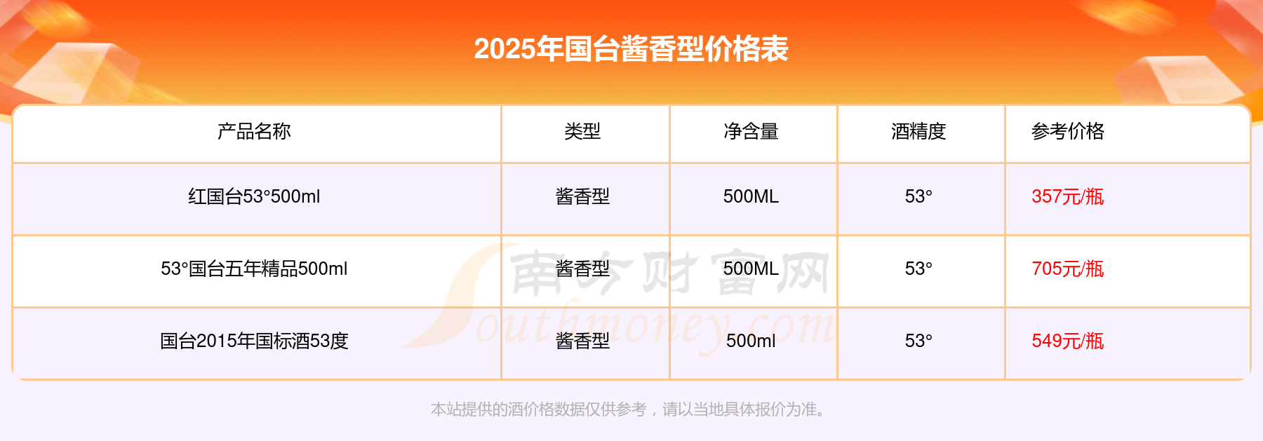 2025年國臺醬香型酒53°國臺五年精品500ml、國臺2015年國標(biāo)酒53度、紅國臺53°500ml等最新價(jià)格如下:53°國臺五年精品500ml參考價(jià)705元/瓶、國臺2015年國標(biāo)酒53度參考價(jià)549元/瓶、紅國臺53°500ml參考價(jià)357元/瓶。