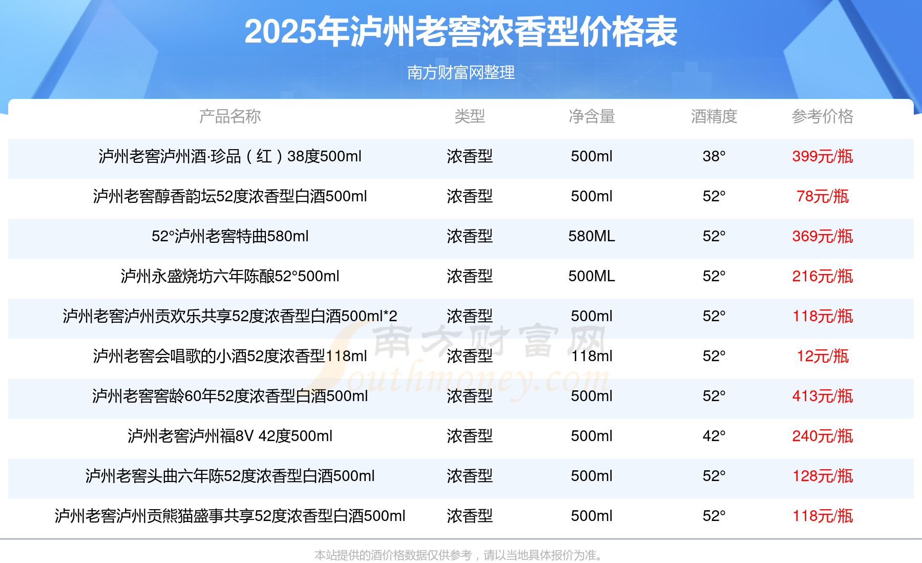 2025年,瀘州老窖國窖1573春釀鼠兆豐年E 55度、瀘州老窖國窖1573生命中的那壇酒55度014、瀘州老窖國窖1573春釀鼠兆豐年A 55度、瀘州老窖國窖1573生命中的那壇酒55度013濃香型白酒1000ml、瀘州老窖國窖1573生命中的那壇酒55度009 1000ml、瀘州老窖國窖1573中國品味52度濃香型白酒500ml等瀘州老窖濃香型酒價格如下: