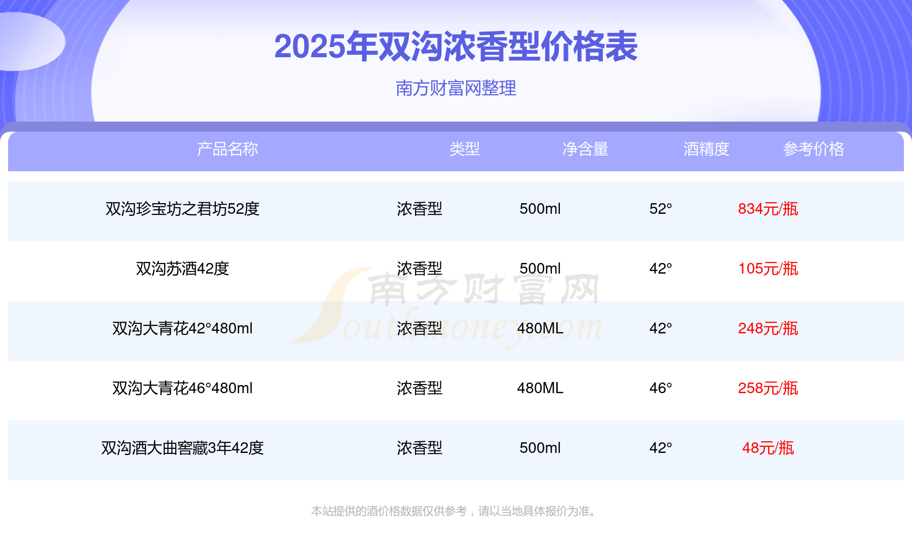 2025雙溝濃香型酒最新價(jià)格:雙溝珍寶坊之君坊52度參考價(jià)834元/瓶、雙溝大青花46°480ml參考價(jià)258元/瓶、雙溝大青花42°480ml參考價(jià)248元/瓶、雙溝蘇酒42度參考價(jià)105元/瓶、雙溝酒大曲窖藏3年42度參考價(jià)48元/瓶。