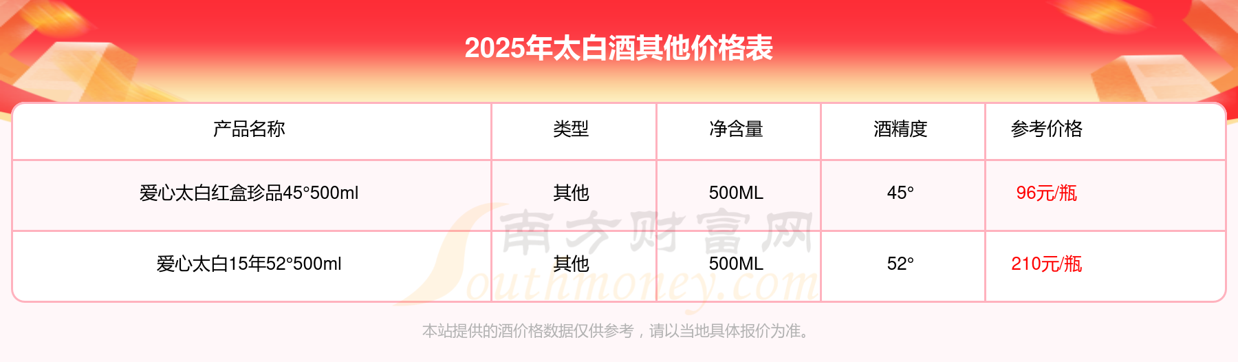 2025年,愛(ài)心太白15年52°500ml、愛(ài)心太白紅盒珍品45°500ml等太白酒其他酒價(jià)格如下:愛(ài)心太白15年52°500ml參考價(jià)210元/瓶、愛(ài)心太白紅盒珍品45°500ml參考價(jià)96元/瓶。