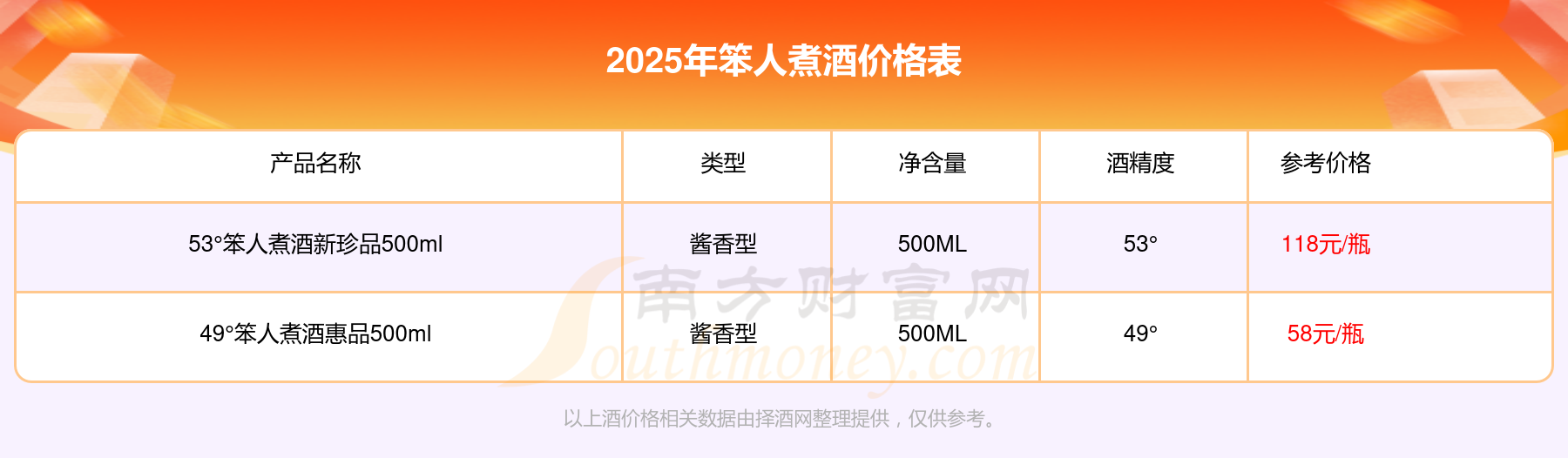 2025年笨人煮酒53°笨人煮酒新珍品500ml、49°笨人煮酒惠品500ml等最新價(jià)格如下: