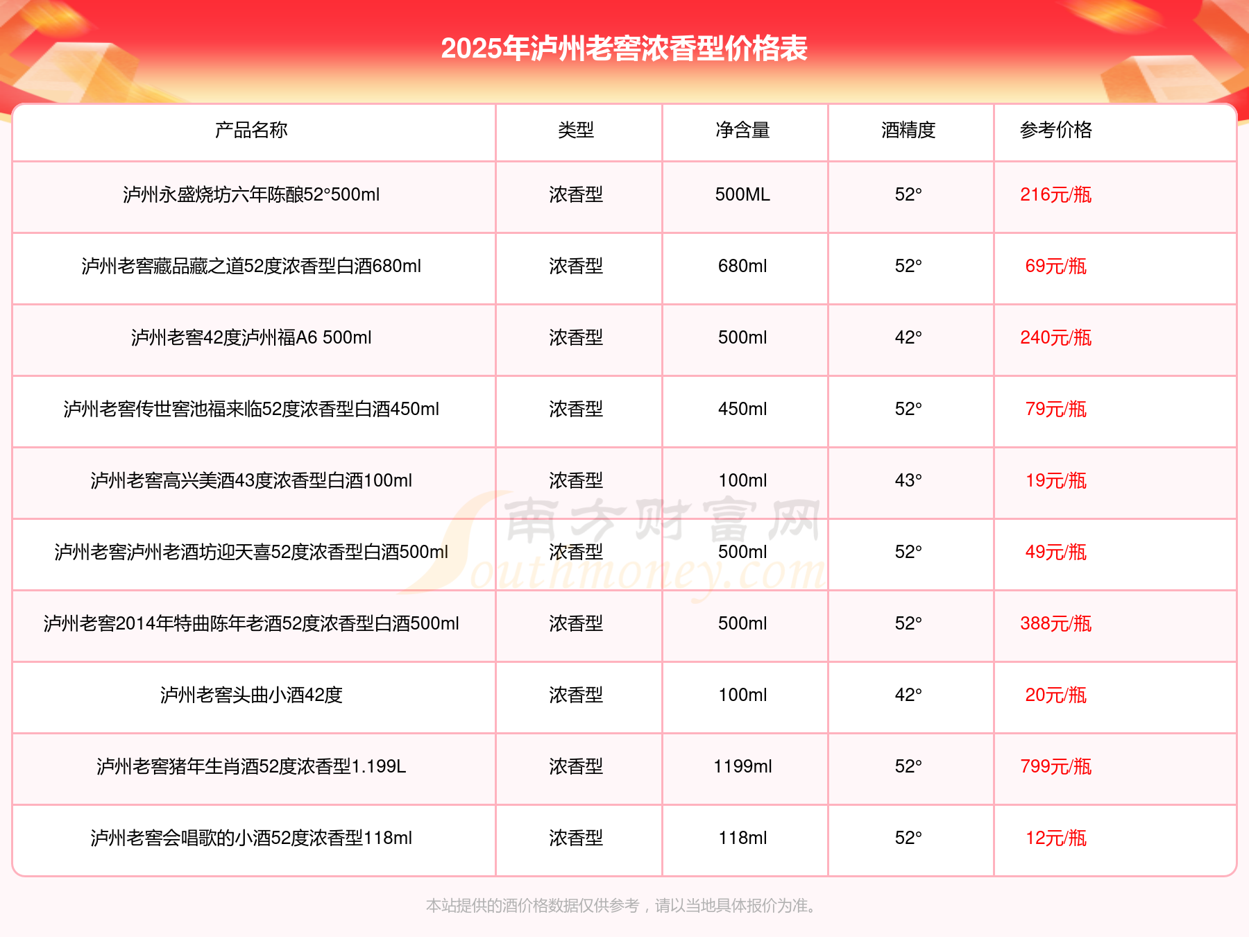 2025年,瀘州老窖國窖1573春釀鼠兆豐年E 55度、瀘州老窖國窖1573生命中的那壇酒55度014、瀘州老窖國窖1573春釀鼠兆豐年A 55度、瀘州老窖國窖1573生命中的那壇酒55度013濃香型白酒1000ml、瀘州老窖國窖1573生命中的那壇酒55度009 1000ml、瀘州老窖國窖1573中國品味52度濃香型白酒500ml等瀘州老窖濃香型酒價(jià)格如下:瀘州老窖國窖1573春釀鼠兆豐年E 55度參考價(jià)17999元/瓶、瀘州老窖國窖1573生命中的那壇酒55度014參考價(jià)9999元/瓶、瀘州老窖國窖1573春釀鼠兆豐年A 55度參考價(jià)5088元/瓶、瀘州老窖國窖1573生命中的那壇酒55度013濃香型白酒1000ml參考價(jià)4988元/瓶、瀘州老窖國窖1573生命中的那壇酒55度009 1000ml參考價(jià)4288元/瓶、瀘州老窖國窖1573中國品味52度濃香型白酒500ml參考價(jià)2888元/瓶。