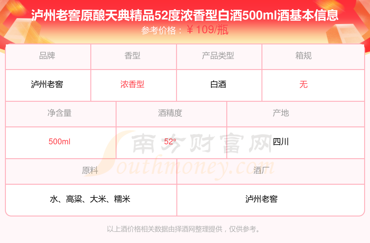 瀘州老窖原釀天典精品52度濃香型白酒500ml基本信息