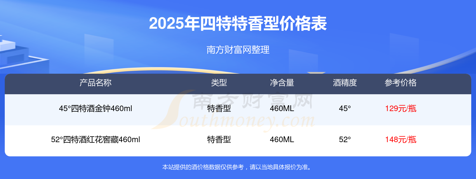 2025年,52°四特酒紅花窖藏460ml、45°四特酒金鐘460ml等四特特香型酒參考價格如下:52°四特酒紅花窖藏460ml參考價148元、45°四特酒金鐘460ml參考價129元。