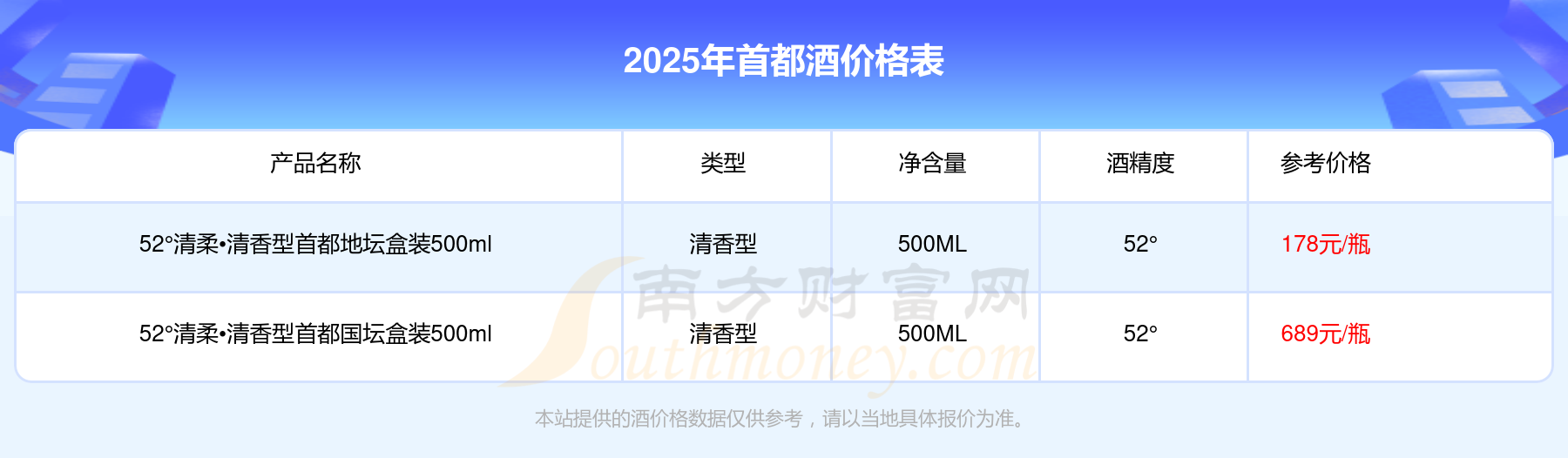 2025年,52°清柔?清香型首都國(guó)壇盒裝500ml、52°清柔?清香型首都地壇盒裝500ml等首都酒價(jià)格如下: